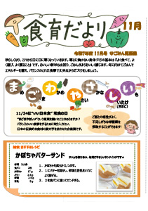 今月の食育教室 しっかり手を洗い、三角巾とエプロン装着可愛いシェフたちは「何をするのかな?」と興味津々…